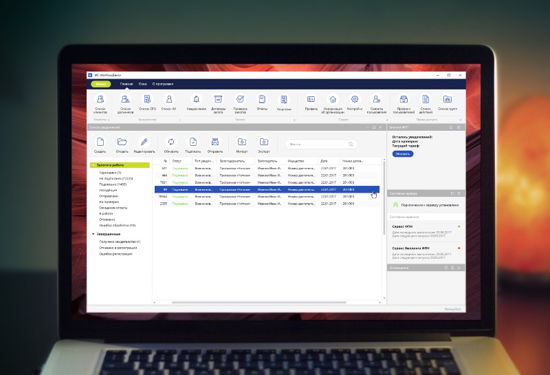 - Отчеты, финансовая статистика - система позволяет формировать различные отчеты, а так же следит за остатками средств на счету в реестре залогов. В случае, если средств на счету останется менее чем указано в настройках системы - программа оповестит сотрудника о необходимости пополнить баланс.