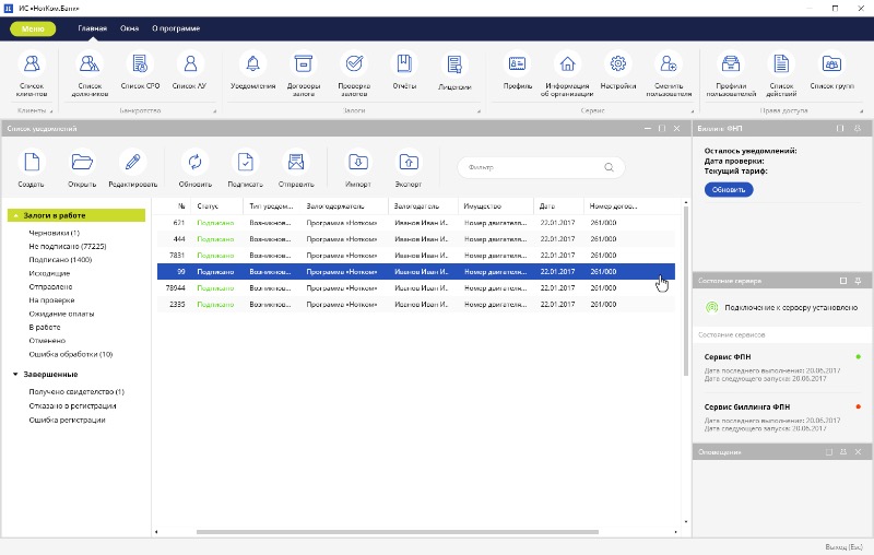 - Хранение всех уведомлений и полученных свидетельств о регистрации в единой базе - АРМ «Нотком.Банк» автоматически отслеживает изменение статуса уведомлений в Ресстре залого движимого имущества. Как только в реестре залогов будет готово свидетельство для вашего уведомления - система автоматически скачет его и сохранит в базе данных. В системе встроен функционал визуализации свидетельств и уведомленией.